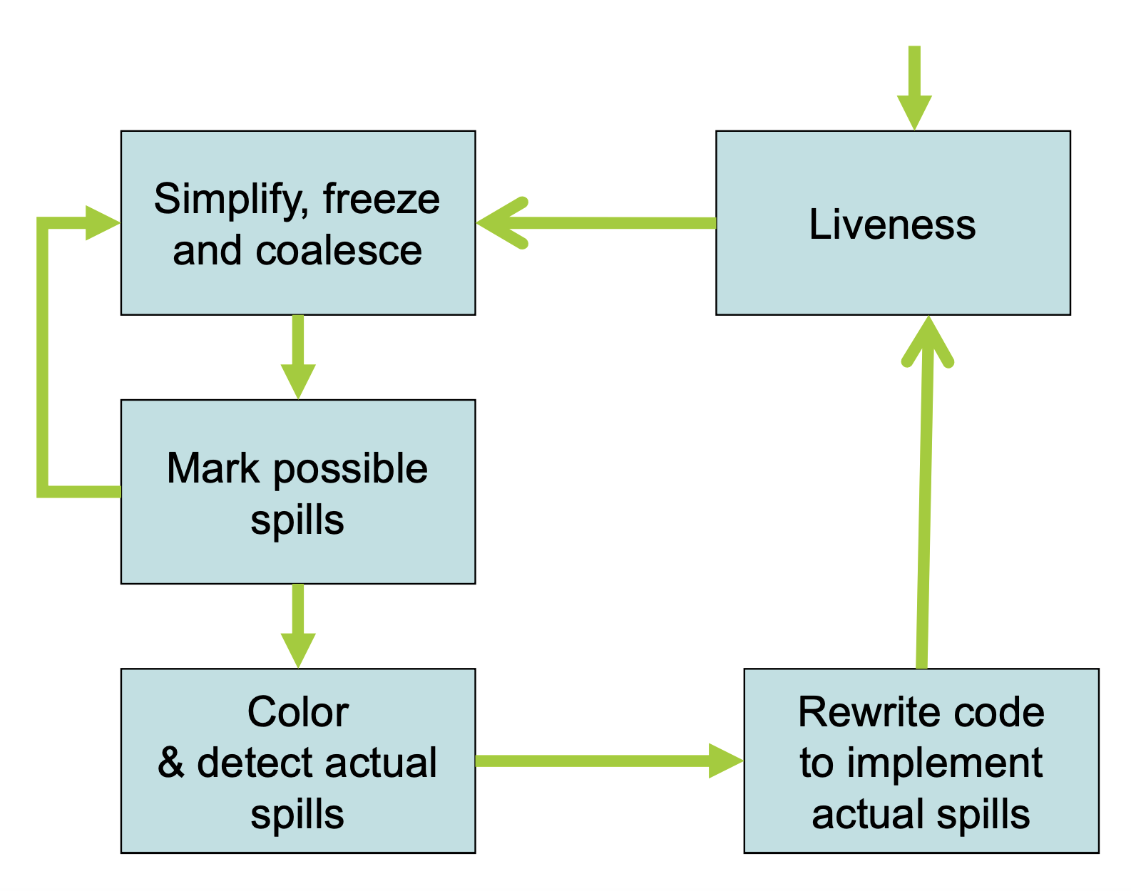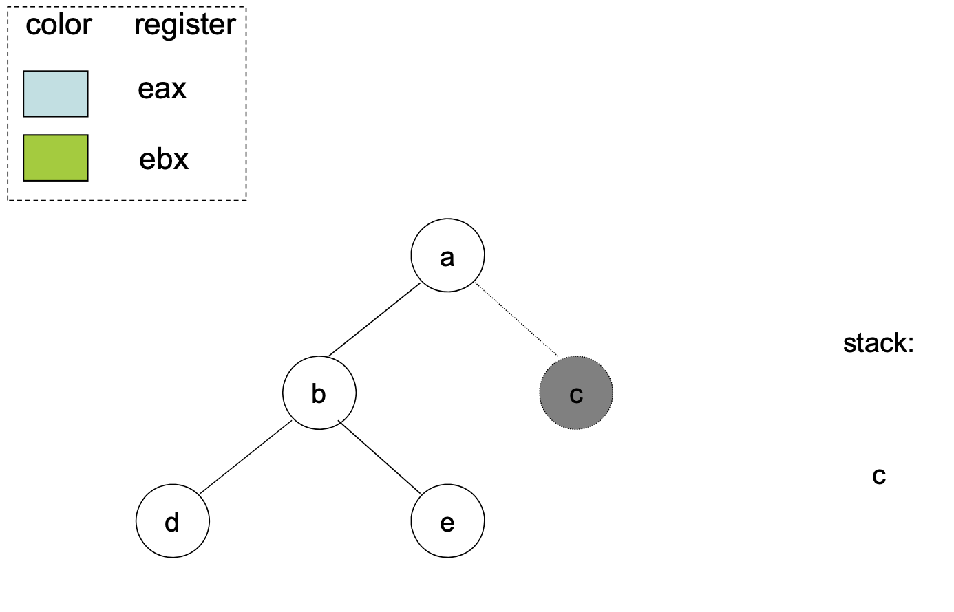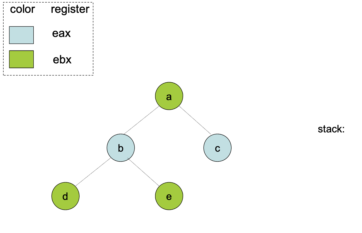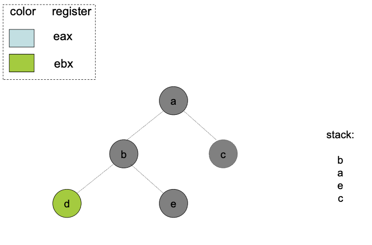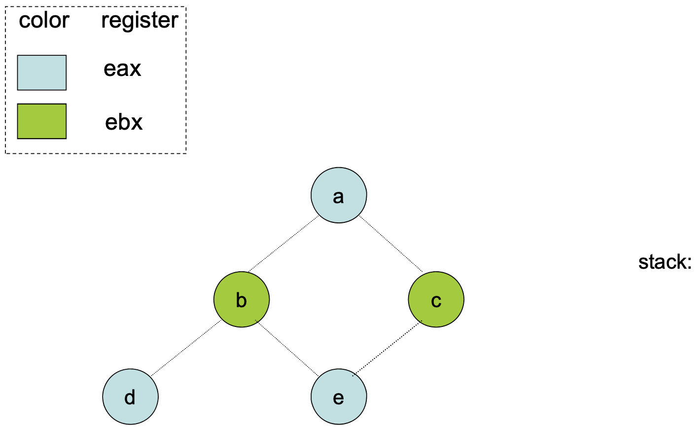 Sometimes, a graph can’t be colored with colors. Then, at that point, we have to choose a variable to put onto the stack. We want this to be out of the critical path, so if possible, we try to remove a variable that is used outside of an inner-loop.